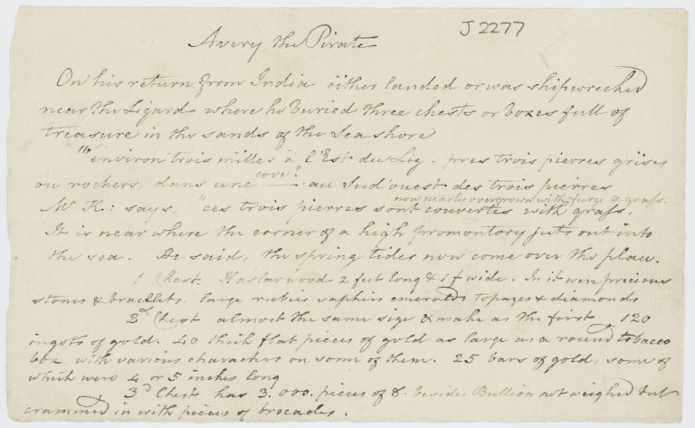 document J-1-2277, Note on Avery the pirate’s treasure, 19th century (J/1/2277) musée de Kresen-Kernow de Redruth