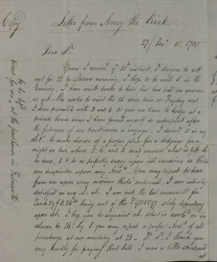 Mais une chose est sûre c’est quand j’ai démarré cette recherche je n’avais pas eu vent de la fameuse lettre d’AVERY du 27 décembre 1700 qui a été rendue public dans un article en 2024. Qui prouve qu’AVERY se trouvait près de Falmouth à 23km à vol d’oiseau…C’est quand même intriguant…