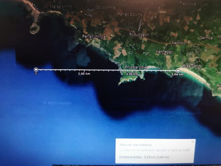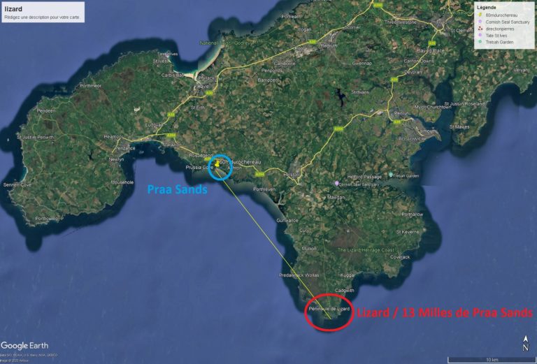 Distance du Lizard à Praa Sands = 13 Milles = 20.92 km (Photo Google Earth)