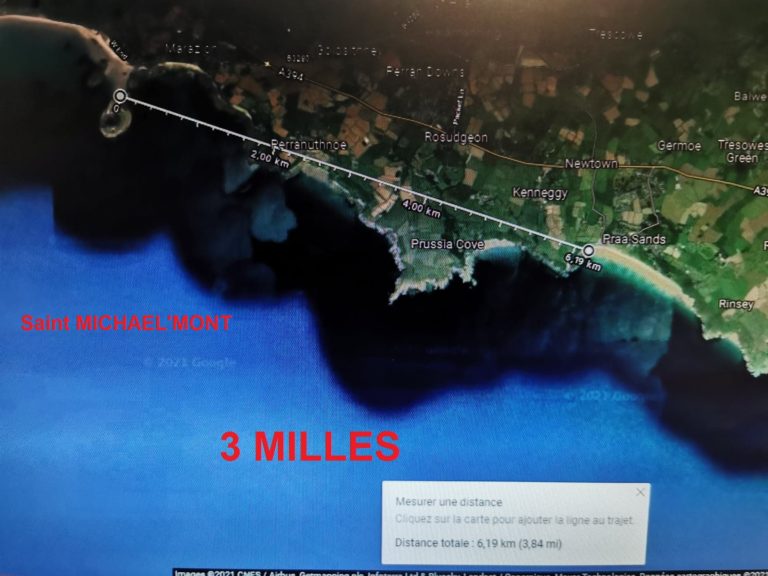 Nous sommes bien à environ 3 Milles à l’Est du Mont Saint Michel (Saint Michael’s Mount)