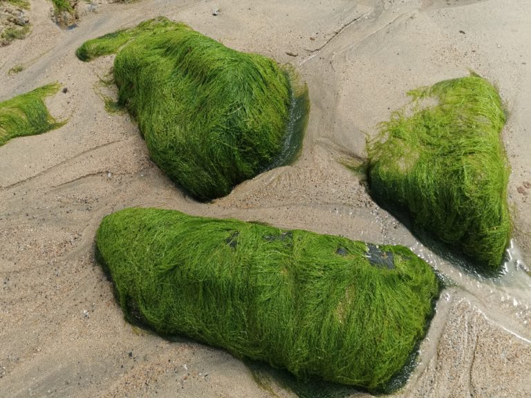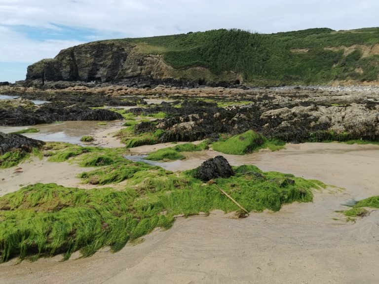 Nous avons bien un promontoire élevé qui vient se jeter dans la mer. Ainsi que des récifs au bord de la plage avec comme vous pouvez voir de l’herbe en FURIE ou GRASSE qui recouvre les rochers gris. Donc les 3 rochers sur la plage devaient être aussi recouvert de ce type d’herbe…Surtout qu’à marée haute l’eau vient recouvrit l’emplacement des 3 coffres.