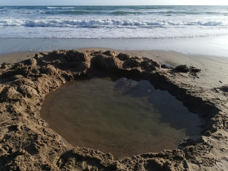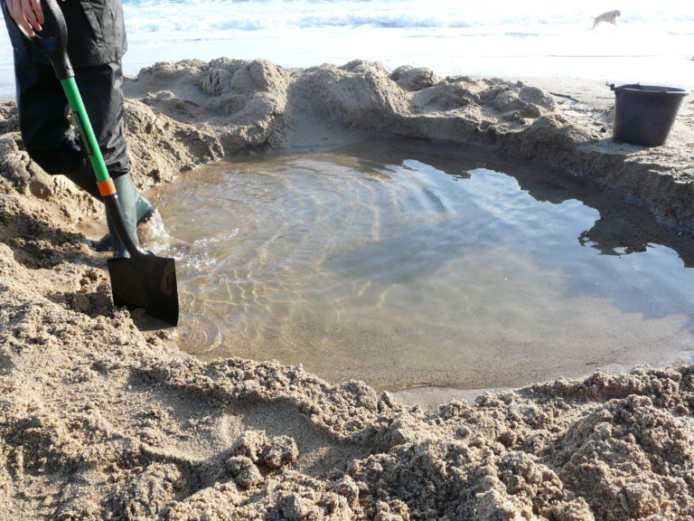 Lors de notre dernier jour, nous avons même tenté d’utiliser une mini-pelle sur la plage, mais cela s’est révélé trop risqué. L’engin risquait de basculer dans le trou qu’il creusait et aurait été submergé par l’eau qui remontait inévitablement.