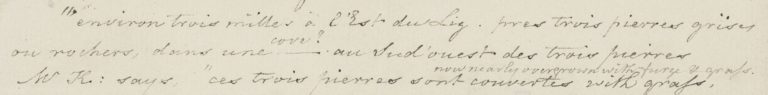 “Environ 3 miles à l’Est du (Lig), près de 3 pierres grises ou rochers dans une crique ? (Ou anse), au Sud-Ouest des 3 pierres.”