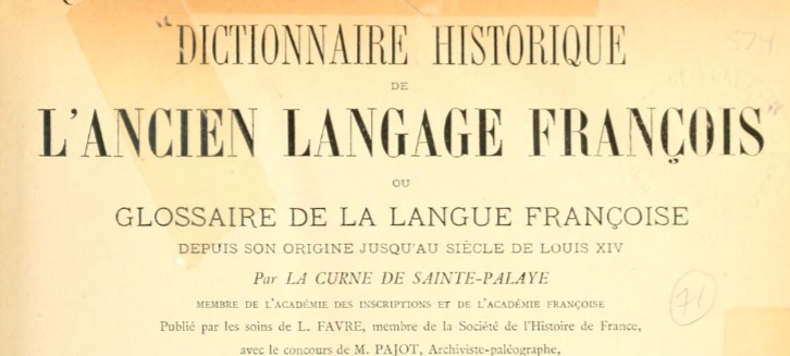 Dictionnaire Historique « L’ANCIEN LANGAGE FRANCOIS », Glossaire de la langue françoise, depuis son origine jusqu’au siècle de Louis XIV, par LA CURNE DE SAINTE-PALAYE